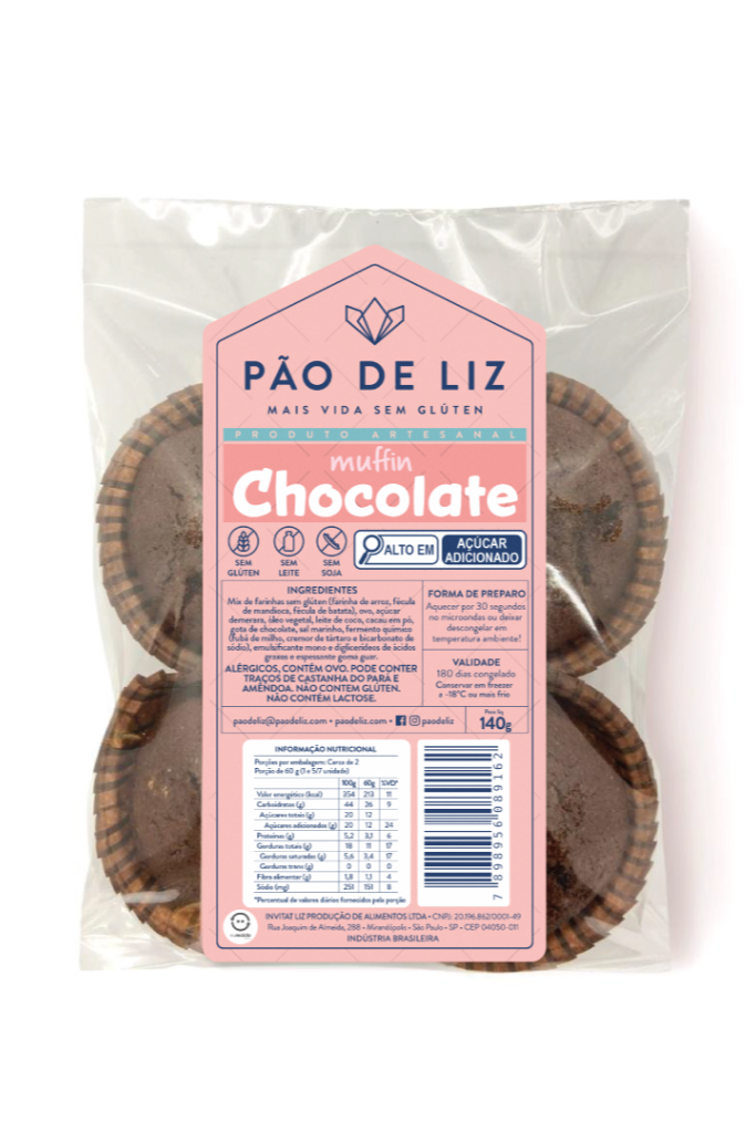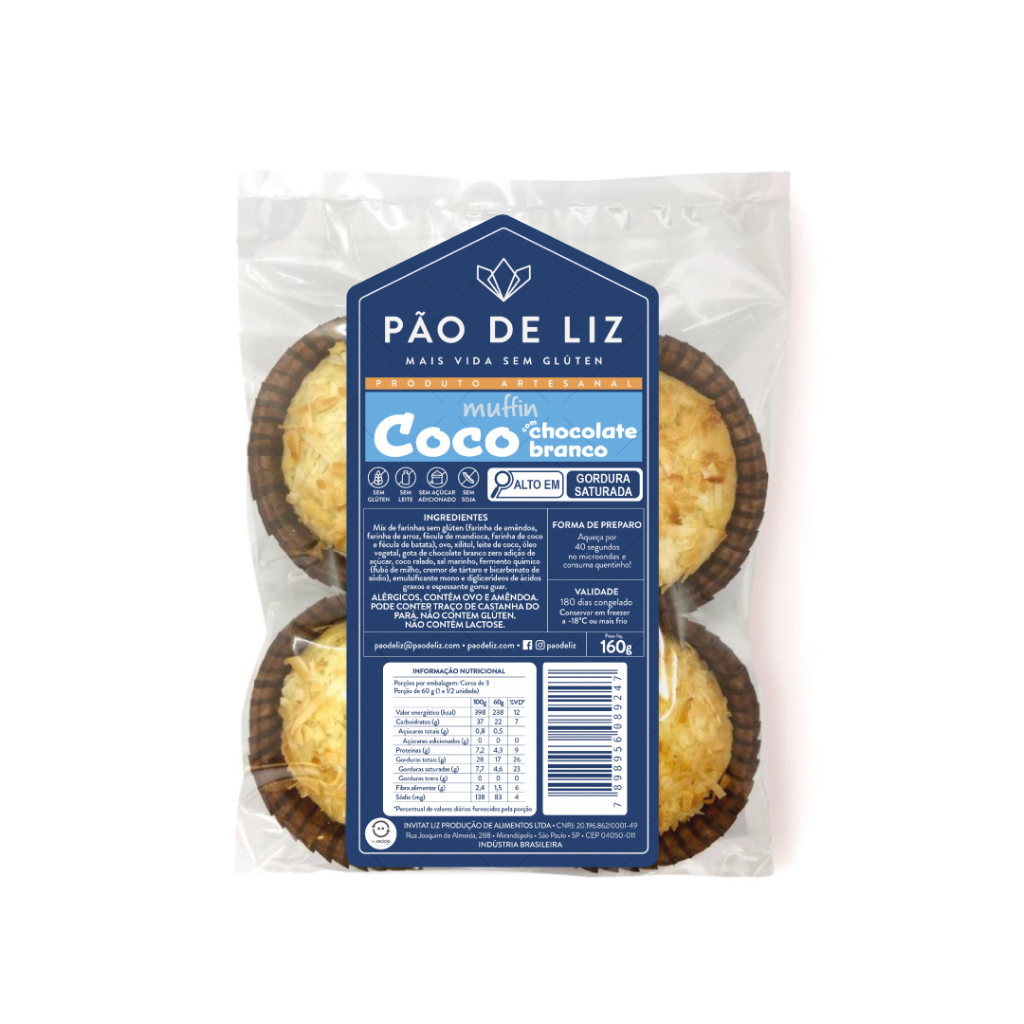 Mix de farinhas sem glúten (farinha de arroz, fécula de mandioca, fécula de batata), ovo, açúcar demerara, óleo vegetal, leite de coco, cacau em pó, gota de chocolate, sal marinho, fermento químico (fubá de milho, cremor de tártaro e bicarbonato de sódio), emulsificante mono e diglicerídeos de ácidos graxos e espessante goma guar.